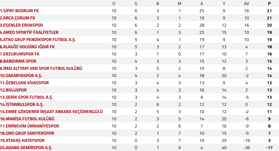Haftanın kapanış gününde Amed Sportif Faaliyetler, Serikspor'u Diagne'nin golleriyle deplasmanda 2-1 mağlup etti. İstanbulspor ise sahasında Bandırmaspor'la 1-1 berabere kaldı. Esenler Erokspor ile deplasmanda 1-1 berabere kalan Sipay Bodrum FK, averajla liderliğini sürdürdü. Boluspor ise Iğdır FK deplasmnından aldığı 1 puanla 10. haftayı 13 puanla 12. sıarada tamamladı.