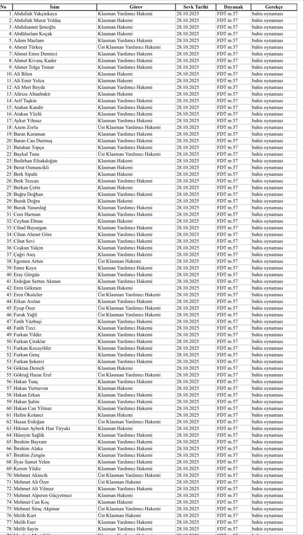 72- Klasman Yardımcı Hakemi MEHMET ALİ YILMAZ’in futbol müsabakalarına ilişkin “bahis oynaması” nedeniyle Futbol Disiplin Talimatı’nın 57. maddesi uyarınca 28.10.2025 tarihinden itibaren tedbirli olarak PFDK'ya sevkine karar verilmiştir.
