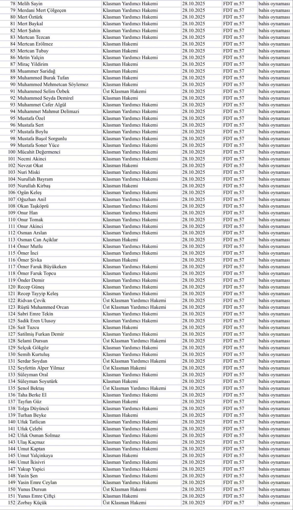 80- Klasman Yardımcı Hakemi MERT ÖZTÜRK’ün futbol müsabakalarına ilişkin “bahis oynaması” nedeniyle Futbol Disiplin Talimatı’nın 57. maddesi uyarınca 28.10.2025 tarihinden itibaren tedbirli olarak PFDK'ya sevkine karar verilmiştir.